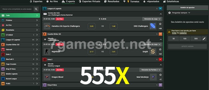 O 555X oferece uma grande seleção de opções de apostas em e-sports com probabilidades competitivas